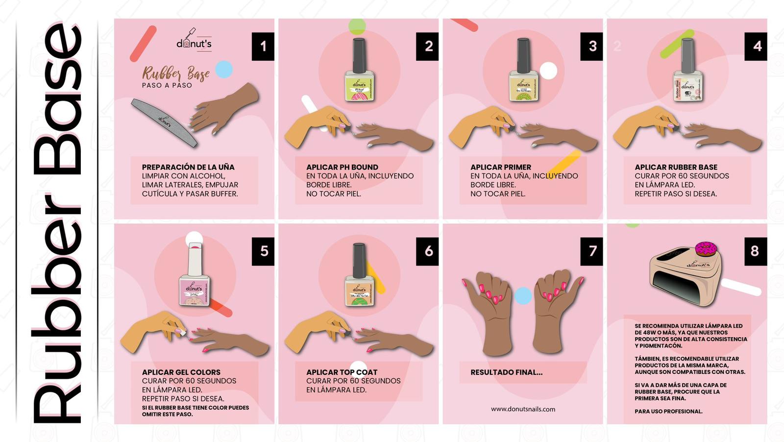 With just preparing the nail and applying our Rubber Base, following with the preferred builder, hard gel, acry/poly gel, gel color and top coat your nail are ready for at last 4 weeks.